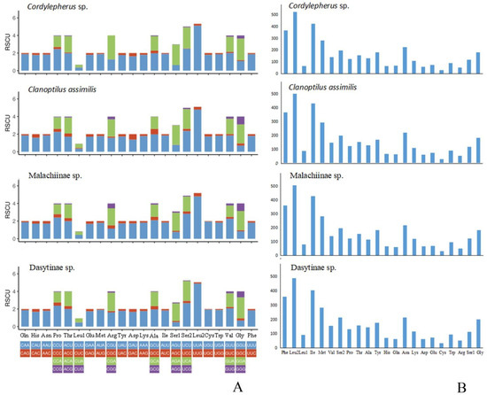 (A) Relative synonymous codon usage (RSCU) in the Melyridae species’ mitogenomes; (B) amino acid composition in the Melyridae species’ mitogenomes.