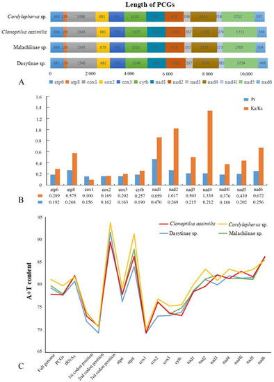 (A) Comparison of 13 PCGs in lengths of Melyridae species; (B) nucleotide diversity (Pi) and nonsynonymous (Ka) to synonymous (Ks) substitution rate ratios of 13 PCGs of Melyridae species (the Pi and Ka/Ks values of each PCGs shown under the gene name); (C) comparison of AT contents in different regions of mitogenomes of Melyridae species.