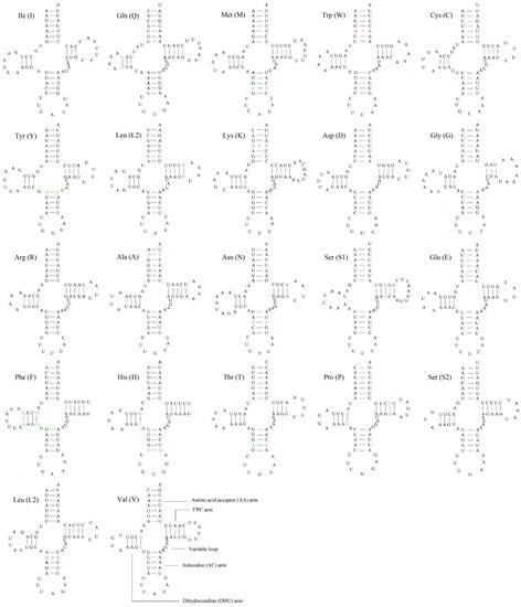 - Lowe, T.M.; Eddy, S.R. tRNAscan-SE.A program for improved detection of transfer RNA genes in genomic sequence. Nucleic Acids Res. 1997, 25, 955–964. [Google Scholar] [CrossRef] [PubMed]