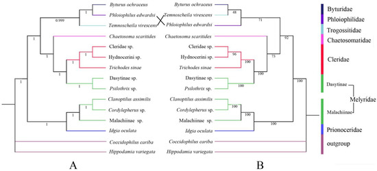 Similar topologies are yielded from ML (Figure 5A) and BI (Figure 5B) analyses with high nodal support values. The monophyly of Cleroidea is highly supported (PP = 1, BS = 100), with Byturidae included in it [56]. Within Cleroidea, it is divided into three branches. One clade consists of Malachiinae and Prionoceridae, with a high statistical support value (PP = 1, BS = 100). The other two clades (Chaetosomatidae (Dasytinae, Cleridae)) and (Trogossitidae, Phloiophilidae and Byturidae) seem more closely related in the tree and supported with a relatively high value (PP = 1, BS = 92). However, within each of the latter two clades, the interrelationships among the included taxa are not strongly supported in the BI analysis, except the sister relationship between Dasytinae and Cleridae (PP = 1, BS = 100).
