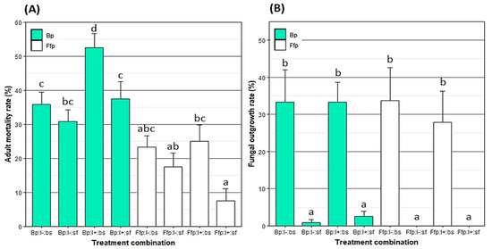 Mean ± SE of (A) mortality rate (%) of Myzus persicae eight days after exposure to a spray of B. bassiana and/or release on B. bassiana-inoculated plants and (B) fungal outgrowth rate (%) from M. persicae cadavers after ten days of incubation. Treatments were based on combinations of plant type (Bp: B. bassiana-inoculated plant; Ffp: fungal-free plant), insect infectious status (I+: viruliferous; I-: non-viruliferous) and insect spraying (bs: with B. bassiana spore suspension; sf: with spore-free solution). Treatments followed by a different letter differed significantly (p < 0.05). n = Ffp:I−:sf, Ffp:I−:bs, Ffp:I+:sf and Ffp:I+:bs = 24; Bp:I−:sf = 16; Bp:I−:bs = 14; Bp:I+:sf = 15; and Bp:I+:bs = 17.