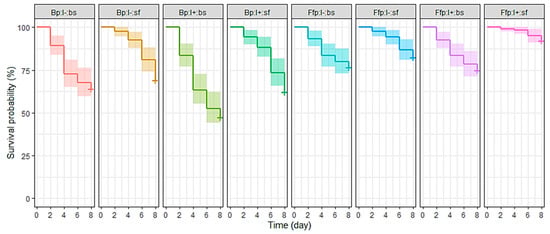 Survival curves of Myzus persicae for eight days after exposure to a spray of B. bassiana and/or release on B. bassiana-inoculated plants. Treatments were based on combinations of plant type (Bp: B. bassiana-inoculated plant; Ffp: fungal-free plant), insect infectious status (I+: viruliferous; I−: non-viruliferous) and insect spraying (bs: with B. bassiana spore suspension; sf: with spore-free solution). n = Ffp:I−:sf, Ffp:I−:bs, Ffp:I+:sf and Ffp:I+:bs = 120; Bp:I−:sf = 80; Bp:I−:bs = 70; Bp:I+:sf = 75; and Bp:I+:sf = 85.