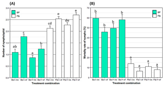 Mean ± SE of (A) fecundity per capita of Myzus persicae and (B) mortality rate of nymphs laid eight days after release on B. bassiana-inoculated or fungal-free plants. Treatments were based on combinations of plant type (Bp: B. bassiana-inoculated plant; Ffp: fungal-free plant), insect infectious status (I+: viruliferous; I−: non-viruliferous) and insect spraying (bs: with B. bassiana spore suspension; sf: with spore-free solution). Treatments followed by a different letter differ significantly (p < 0.05). n = Ffp:I−:sf, Ffp:I−:bs, Ffp:I+:sf and Ffp:I+:bs = 36; Bp:I−:sf = 31; Bp:I−:bs = 24; Bp:I+:sf = 22; and Bp:I+:sf = 34.