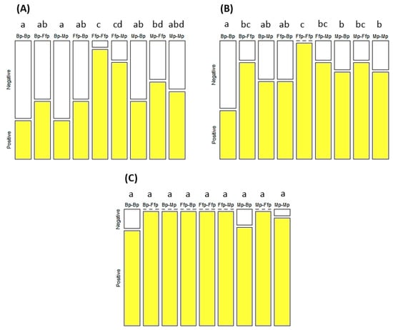Percentage of PLRV-infected (positive) and non-infected (negative) tobacco after seven (A), eleven (B), and fifteen (C) days of incubation. Treatments were based on combinations of B. bassiana-inoculated plants (Bp), M. acridum-inoculated plants (Mp), and fungal-free plants (Ffp), as well as a control, as source (two first letters) and recipient (two last letters) plants. Treatments followed by different letters were significantly different (p < 0.05). n = Bp–Ffp, Mp–Ffp, and Ffp–Ffp = 36; Bp–Bp = 32; Bp–Mp = 29; Ffp–Bp = 26; Ffp–Mp = 30; Mp–Bp = 25; and Mp–Mp = 30.