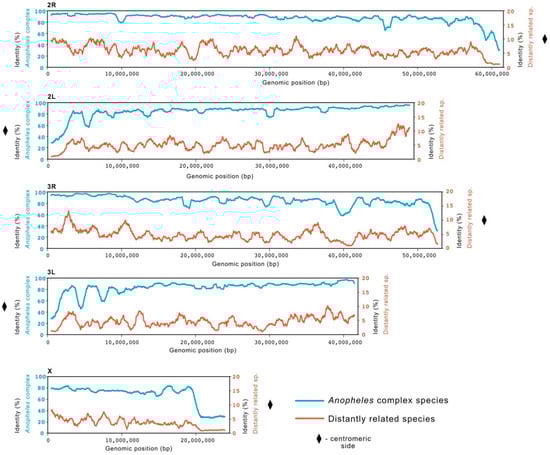 The genome identity at the chromosomal level was investigated and compared between the two clusters. We calculated mean identity of 81.0% across the genomes of species within the Anopheles gambiae complex (84.4% in autosomes and 67.2% in X chromosome) and 4.8% for the genomes of distantly related species (5.12% in autosomes and 3.69% in X chromosomes). Both groups showed decreased conservation toward the centromeric end of each chromosome and on X chromosome compared to autosomes (Figure 1).