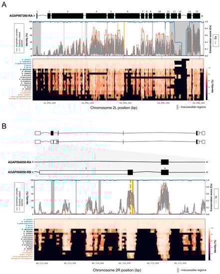It must also be noted that confounding sources might lead to ultraconservation that do not necessarily reflect functional constraint. For instance, repetitive regions of the genome and their representation in the reference genome assemblies can lead to ambiguous genome alignments and false identical regions. We used genome accessibility data generated in the Ag1000g project that includes already annotated, masked, low-complexity genomic regions and DNA sequences with low coverage and poor mapping quality [22,23] to label these regions in the analyzed genes. High conservation score in regions marked as inaccessible (Figure 2) should be considered and taken cautiously as indicator of functional constraint. In addition, many families of repetitive sequences, such as satellite DNA and ribosomal DNA genes, are maintained homogenous within populations by concerted evolution rather than unbreakable constraint [45]. Concerted evolution for such elements should be taken into account when conservation within and among different species is evaluated.