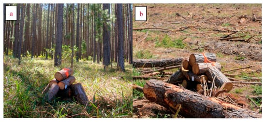Ips grandicollis (Coleoptera: Curculionidae: Scolytinae), the five-spined pine engraver, was introduced to Australia from North America in the 1940s and is now a pest of pine plantations throughout the mainland [,]. Field manipulations were conducted in Pinus spp. plantations at Beerwah, Queensland, Australia (−26.863, 153.040 − 26°51′). The mean daily maximum temperature for September 2017 when this sampling was conducted was 28.9 °C. Billets sampled were harvested from an unmanaged block of pine trees that did not show signs of any previous insect damage. The lengths of the billets ranged from 36 to 43 cm and the diameters (across one end) ranged from 12 to 19 cm. Manipulated piles of billets were set up in one of two environments—the first was an unharvested pine block (46 ha) and the second had been recently felled (42 ha harvested block). The harvested block (between 25 and 30 years old) had been felled within three months prior to the setup of the trial and had a large amount of slash and other pine debris lying on the ground that would have provided additional habitat for bark beetles over the preceding months. The unharvested block was 23 years old and had not been thinned for several years, with very little extraneous dead pine material under the trees, and hence very little suitable habitat for bark beetles in the preceding months. The two blocks were more than 1km apart, considerably greater than the usual dispersal distance for Ips grandicollis (median dispersal distance is 0.13 km) []. In addition to differences in the surrounding environment, two levels of fresh “local substrate availability” were tested in the manipulated log piles that were set up—low availability (five billets) or high availability (ten billets). These numbers were chosen to balance a clear difference in availability (high availability being double the amount of substrate), while being practicable to replicate and monitor within the time period of initial log colonisation. Five replicate piles of both the low and high resource availability were placed in each of the environment types, making 10 piles in each environment (20 piles in total). The piles were systematically placed at 100 m intervals along a transect just off a logging track, alternating between high (ten billet) and low (five billet) local substrate availability piles to reduce spatial confounding effects. Billets in each pile were stacked on top of each other in pairs alternating the direction at each level, so that beetles would have access to all sides of most of the logs, and each pile had an Ipsenol pheromone lure (IP035-40 mg Ipsenol lure from WestGreen Global Technologies) attached to ensure beetle attraction (Figure 1). Ipsenol is the key constituent of the aggregation pheromone produced by male Ips grandicollis to attract conspecifics to overcome tree defences and females specifically to their nuptial chamber for mating.