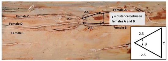 Logs were left in the field for two weeks. After this time, the bark was removed entirely from each log, being careful to ensure all the galleries were left intact and each male nuptial chamber was numbered. To assess harem size and how this changes with resource availability and the environment/habitat differed, the number of females associated with each male was recorded. The distance from a male’s nuptial chamber to the next closest nuptial chamber was measured, as an indicator of how male spacing adapts to changes in the population density or resource availability. Females also have the opportunity to adapt to different population densities and resource availabilities by changing the distance at which make their galleries, which we also measured. Measurements were made between neighbouring galleries at a standardised distance from the male’s nuptial chamber of 2.5 cm (Figure 2). At this distance, the orientation of the galleries within the phloem is generally set and the proximity to other galleries is consistent. Measurements were made sequentially moving from one female to its neighbour in a clockwise direction around a male’s nuptial chamber. The measured distance, along with the standardised 2.5 cm distance gave an isosceles triangle (see Figure 2) from which we were able to calculate the angle, θ, that the females diverged from each other relative to the nuptial chamber. This is generated by the number of angles for each harem equal to the harem size minus one.