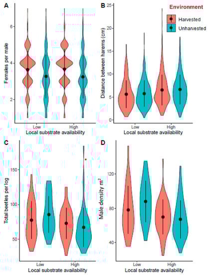 Violin plots indicating the spread and (A) mean (±SD) number of females per male (harem size), (B) mean (±SD) distance to the nearest harem (male nuptial chamber), (C) mean total number of beetles (males and females) per log (±SD), and (D) mean density (±SD) of males on a log (number of males per m2) in relation to local substrate availability (high = 10 logs/pile, low = 5 logs/pile) in harvested and unharvested pine plantations.