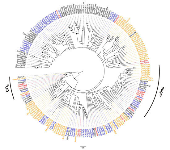 Phylogenetic tree of gustatory receptors (GRs). Red: Harmonia axyridis (Haxy); blue: Tribolium castaneum (Tcas); orange: Drosophila melanogaster (Dmel); black: Dendroctonus ponderosae (Dpon). Numbers and symbols at nodes represent support values higher than 0.9, where 1 represents maximal support.