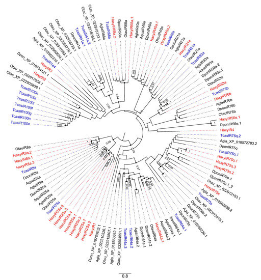 Phylogenetic tree of ionotropic receptors (IRs). Red: Harmonia axyridis (Haxy); blue: Tribolium castaneum (Tcas); black: Ambrostoma quadriimpressum (Aqua), Anoplophora glabripennis (Agla), Dendroctonus ponderosae (Dpon), and Onthophagus taurus (Otau). Numbers and symbols at nodes represent support values higher than 0.9, where 1 represents maximal support.