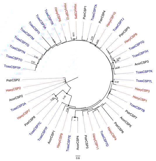 Phylogenetic tree of chemosensory proteins (CSPs). Red: Harmonia axyridis (Haxy); blue: Tribolium castaneum (Tcas); black: Anomala corpulenta (Acor) and Phyllotreta striolata (Pstr). Numbers and symbols at nodes represent support values higher than 0.9, where 1 represents maximal support.