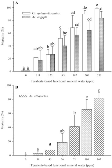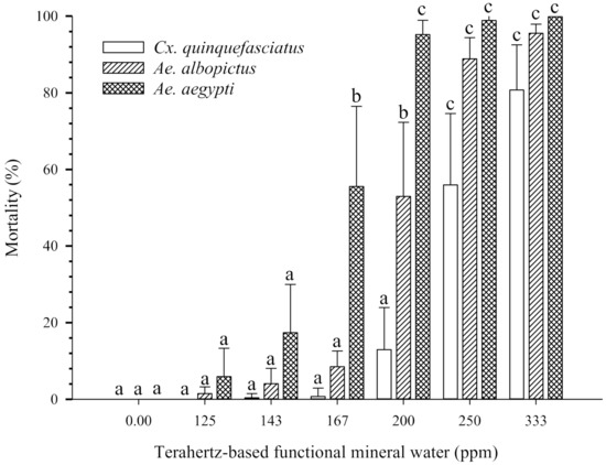 Effects of terahertz-based functional mineral water on mosquito larvae. The third instar larvae were exposed to various concentrations of terahertz-based functional mineral water, and the mortality of the larvae was recorded after 24 h. Data are presented as mean ± SE values from at least three independent experiments, and different letters indicate significant differences (p < 0.05) between different concentrations at each species.