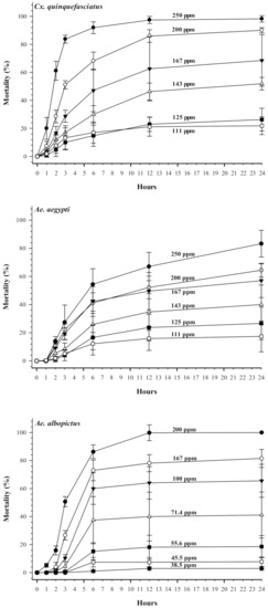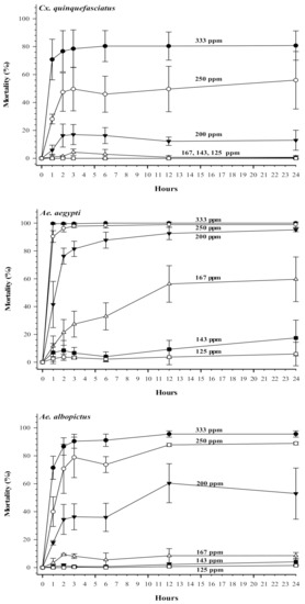 Figure 2 shows mortality over 24 h of mosquito larvae at various concentrations of terahertz-based functional mineral water. High concentrations of terahertz-based functional mineral water could effectively kill mosquito larvae in a short period. For example, at 333 ppm, terahertz-based functional mineral water resulted in 100% mortality of Ae. aegypti larvae within one hour, and Ae. albopictus and Cx. quinquefasciatus larvae reached 80% mortality within two hours. The larval mortality increased significantly in a time course-dependent manner in new prepared terahertz-based functional mineral water (Figure 2); however, the larvicidal activity of diluted terahertz-based functional mineral water diminished after 24 h (Figure 3).