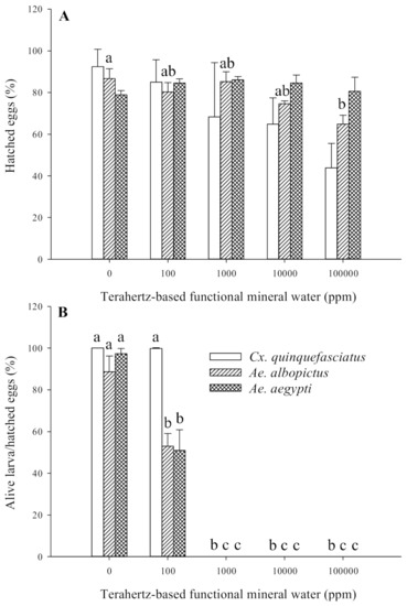 The effect of terahertz-based functional mineral water on the hatching rate of mosquito larvae is displayed in Figure 6. The eggs were the least susceptible to terahertz-based functional mineral water. Although, terahertz-based functional mineral water did not affect the hatching rate of Ae. aegypti larvae, it still inhibited the hatching rate of Cx. quinquefasciatus larvae in the presence of 100−100,000 ppm in a concentration-dependent manner. The hatching rate of Ae. albopictus larvae only significantly decreased when treated with higher concentrations of terahertz-based functional mineral water (10,000 and 100,000 ppm) (Figure 6A). Nonetheless, no hatched larva of any species could survive at concentrations higher than 100 ppm (Figure 6B).