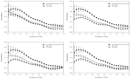 Figure 7 shows the optical properties of terahertz-based functional mineral water at different dilutions in the frequency range of 0.1–1.0 THz. Liquid water has long been considered a strong absorbent for terahertz radiation [31]. As shown in Figure 7, the undiluted terahertz-based functional mineral water exhibited a higher transmission rate of terahertz waves than pure RO water; however, the transmission rate significantly decreased when diluted with RO water. The diluted terahertz-based functional mineral water (125 ppm) showed a lower transmission of terahertz waves only in the range of 0.7–1.0 THz; however, it exhibited a lower transmission rate than water in the frequency of 0.1–1.0 THz at 167–500 ppm. In particular, the transmission rates of terahertz-based functional mineral water at 167–500 ppm were lower than that of RO water at a frequency of less than 0.6 THz. The discrepancies in transmission rate between the diluted terahertz-based functional mineral water and pure RO water diminished after 24 h (data not shown). These results were consistent with the loss of larvicidal and pupicidal activity a day after the dilution of terahertz-based functional mineral water.