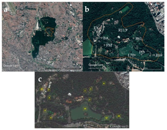 The study was performed inside the São Paulo Zoo, which is located in the Parque Estadual das Fontes do Ipiranga (PEFI), an area of Atlantic Forest remnant with intense anthropic influence at its borders. In addition to the approximately 3000 captive animals, many free-living and migratory birds inhabit the surrounding areas of the existent lakes in the park area (Figure 1a). Eight sampling areas (Figure 1b) were selected considering the distribution of the probable sites of infection of captive animals surveyed in a previous study [] (Figure 1c).