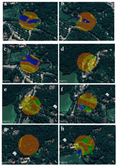 Sampling areas in São Paulo Zoo: site PO (a), site R69 (b), site L70 (c), site EX (d), site BA (e), site FM (f), site R113 (g), and site R61 (h). Small circles in the center indicate the exact point where the Center for Disease Control (CDC) traps were installed. Buffers extending 200 m diameter were created around each sampling site to define the surrounding landscape. Yellow represents areas where there is human activity (paving and edification), blue represents lake area, green shows bush/sand/grass areas, and orange shows forest cover.