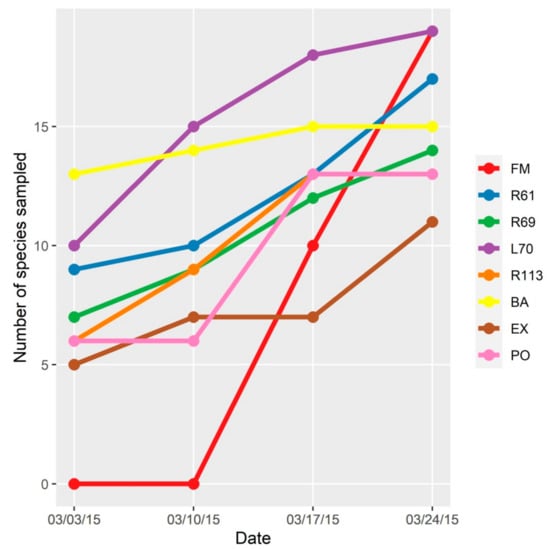 Mosquito sampling effort was estimated by plotting a species accumulation curve to verify the sampling sufficiency to assess richness, directly related to the number of rare species in the samples, for each of the eight collection sites, and the measures of biodiversity were obtained using Shannon–Winer Diversity Index (H), as described elsewhere [].