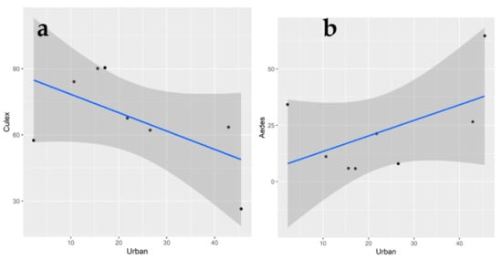 We also analyzed if the mosquito diversity was affected by the landscape composition factors. A linear regression of anthropogenic changes on mosquito’s density was obtained in each site, using two classes of land use directly related to urbanization (edification and paving areas). Linear models were implemented using the lm function in the software R 4.0.0. [].