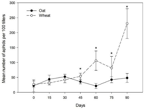 Aphid abundance on different host plants across the season. Mean number of aphids (±SE) on oat and wheat fields in the different sampling dates across one season. * Represents significant differences in the aphid abundance between host plants.