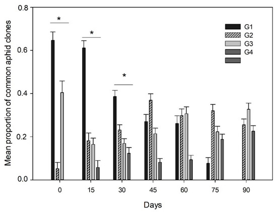 Predominance of common aphid clones across the season. Mean proportion (±SE) of the aphid clones G1, G2, G3 and G4 in the different sampling dates across one season. * Represents significant differences in the mean proportion of aphid clones in a sampling date.