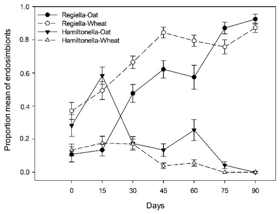Interestingly, we observed that irrespective of the host-plant studied here, there are rapid seasonal shifts in the frequency of the facultative endosymbionts in the natural host populations studied. Unlike H. defensa, the frequency of the more prevalent facultative endosymbiont, R. insecticola, increased most probably through the population growth of their hosts, achieving high levels of infection on both oats (~93%) and wheat (~87%) towards the end of the studied season.