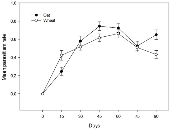Mean parasitism rates in oat and wheat fields across the different sampling dates.