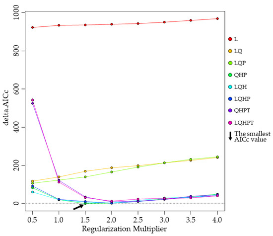 The following parameters were also used in the model analysis. We used random seed, which is similar to bootstrapping, where each run will use a different random seed. The random test percentage was set to 25, which means that 75% of the occurrence points are randomly selected as the training set, and the remaining 25% are used as the test set. We used the ArcMap software, DIVA-GIS software v7.5.0 (https://www.diva-gis.org/) (accessed on 4 March 2021), and R software v4.0.3 (https://www.r-project.org/) (accessed on 4 March 2021) to calculate the regularization multiplier (RM). The R packages ENMeval, dismo, dotCall64, fields, grid, knitr, maps, maptools, raster, rgeos, sp, spam, and spThin were used to calculate the RM and feature classes (FC). The RM was set to 0.5, 1.0, 1.5, 2.0, 2.5, 3.0, 3.5, and 4.0. The FC included linear (L), quadratic (Q), hinge (H), product (P), and threshold (T). The ENMeval package was used to calculate the corrected Akaike information criterion correction value (AICc value) under different parameters. The AICc value was used to estimate the maximum entropy model’s complexity, with the smallest AICc value corresponding to the FC combination and preferred RM [45]. We tested eight different FC combinations, including L, LQ, LQP, QHP, LQH, LQHP, QHPT, and LQHPT [32,46,47]. The checkerboard2 method was used to calculate the AICc value. The model was run 20 times under the same setting to further reduce the randomness of predicted results, with the final result presented as the replicates’ average [48].