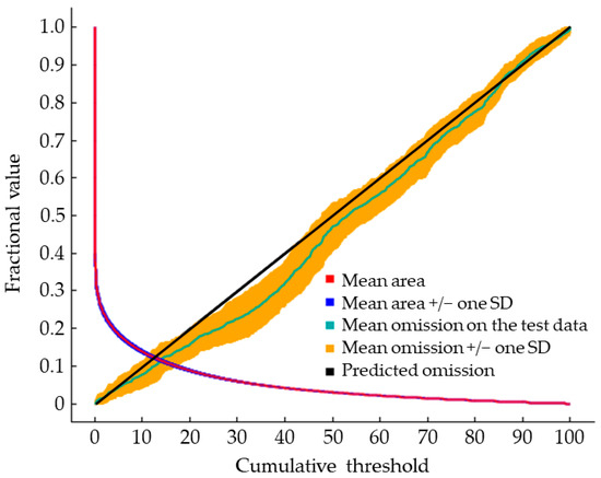 The area under the receiver operating characteristic (ROC) curve (AUC), the AUC value, is widely used to estimate the predictive accuracy of the maximum entropy model [50,51,52]. The following criteria are used to determine if the predicted accuracy has no predictive ability or a high predictive ability: AUC value range from 0.5 ≤ to ≤ 1; the output showing 0.5 ≤ AUC ≤ 0.6 is considered no predictive ability; 0.6 < AUC ≤ 0.7 is a poor predictive ability; 0.7 < AUC ≤ 0.8 is a general predictive ability; 0.8 < AUC ≤ 0.9 is a moderate predictive ability; 0.9 < AUC ≤ 1.0 is a high predictive ability. To eliminate the possible deviations of the AUC value, we used the AUC value of the partial-area ROC (P-ROC AUC) to estimate the predictive accuracy of the maximum entropy model. We used a 5% error rate (E = 0.05) to calculate the AUC ratios, AUC ratio = AUCE/AUC0.5, by using the Niche Analyst software v3.0 (http://nichea.sourceforge.net/) (Calculate AUC value of partial—area ROC approaches). The AUC ratio > 1 indicated that the model has a high credibility [53]. Moreover, we used a minimum training presence omission rate (ORmtp), 0 as expected value, and 10 percentile training presence omission rates (OR10), 0.1 as the expected value, to verify whether the model was overfitting [30,49,54]. When the model has a higher AUC value and a lower omission rate, it means it has a high predictive ability.