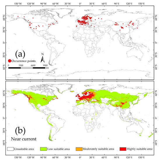 (a) Current occurrence and global distribution of S. juvencus; (b) The predicted area suitability under the near current climate condition. S. juvencus has the potential to occupy over 33.55% of the land area of the world except for the unsuitable continent, Antarctica, which shows high suitability for the occurrence of S. juvencus.