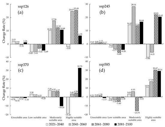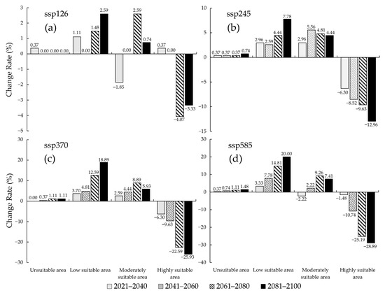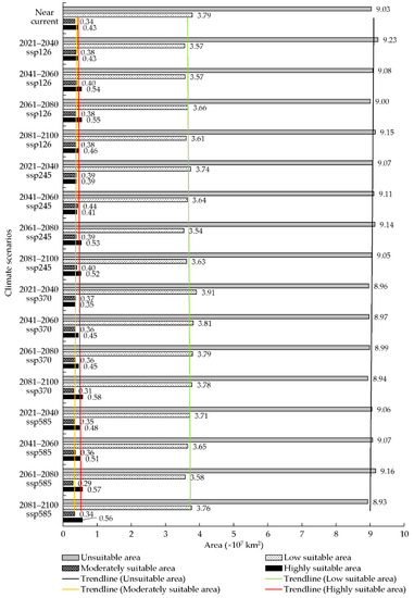 The increasing trend of highly suitable areas is evident under various future climate scenarios (Figure 8). Moderately suitable areas show an increasing trend under future climate scenarios 2081–2100 ssp126 and ssp245 (Figure 8a,b). The maximum observed increase in the predicted highly suitable area appears in the period 2081–2100 ssp370, reaching an area of 0.58 × 107 km2, with an increase of 32.79% compared to that under near current climate conditions (Figure 8c) and an increasing trend for the same period under ssp245 and ssp585 (Figure 8b,d). While the minimum suitability area was predicted for the period 2021–2040 ssp370, reaching an area of 0.35 × 107 km2, with a decrease of 18.46% compared to that under near current climate conditions (Figure 8c). Overall, the trends for low suitable areas are similar in different future climate conditions.