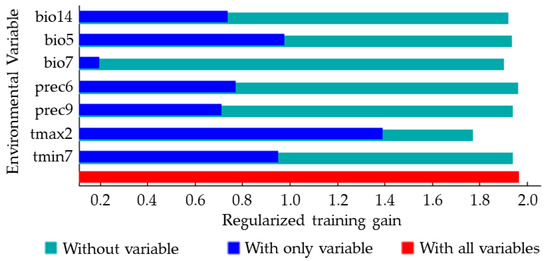 The jackknife method was used to analyze the importance of the seven environmental variables that strongly impacted the distribution of S. juvencus (Figure 5). The longer the blue bar is, the more influential the variable is to the species distribution, and the shorter the green bar is, the more information the variable has compared to others (Figure 5). Among the seven environmental variables, the two environmental variables that have a greater impact on the distribution of S. juvencus were monthly average maximum temperature in February (tmax2), max temperature of the warmest month (bio5), and monthly average minimum temperature in July (tmin7) (Figure 5). Besides, the influence of the bio5 and tmin7 are very close. The monthly average maximum temperature in February (tmax2) provided the most information with regard to the distribution of S. juvencus, contributed significantly, and gave unique information in predicting area suitability.