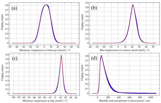 Response curves between the distribution probability of S. juvencus and environmental variables: (a) Maximum temperature in February; (b) Max temperature of warmest month; (c) Minimum temperature in July; (d) Monthly total precipitation in June. Values shown are average over 20 replicate runs: blue margins show ± SD calculated over 20 replicates.