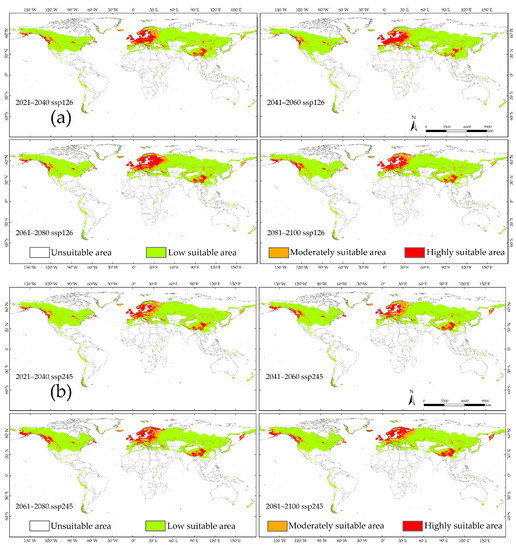Comparing the range of the potentially suitable area of S. juvencus under the future climate conditions with that under the near current climate conditions, the area of the total suitable area was increasing under the four CMPI6 climate scenarios, with a slight increase of 0.37% in highly suitable areas under climate scenario 2021–2040 ssp126, an increase in land area from 9.03 × 107 km2 to 9.23 × 107 km2 of predicted potentially highly suitable areas. The percentage of increase in the area of the moderately suitable area was 9.26%, and that of the low suitable area was 20.00%, showing a more rapid increase in suitability under the scenarios 2061–2080 ssp585 and 2041–2060 ssp585; under the same climate scenarios, low suitable areas increased by 1.48%. Overall, under the climate scenarios 2081–2100 ssp585 (highly suitable area), 2021–2040 ssp126 (moderately suitable area), and 2041–2060 ssp126 (low suitable area), there is a rapid decrease in the highly suitable area and a general decrease in the moderately and low suitable areas, which could be associated with rainfall patterns and temperature variations in these periods and climate scenarios that would affect the lifecycle of S. juvencus as well as its obligate mutualistic fungus. The most apparent changes in the suitable areas were in Europe, North America, and Southwest China. In Europe, the suitable area moved towards the north. The area of the highly suitable area increased in northwestern North America and Southwest China. By comparing the change rate of existence probability of the current occurrence points, we can also analyze which CMIP6 climate scenario is more reasonable under different future climate conditions. In the climate scenarios 2081–2100 ssp370 (highly suitable area), 2021–2040 ssp245 (moderately suitable area), 2021–2040 ssp370 (low suitable area), and 2021–2400 ssp126 (unsuitable area), the increases were 37.79%, 28.14%, 3.30%, and 2.15%, respectively. Furthermore, in the climate scenarios 2021–2040 ssp370 (highly suitable area), 2061–2080 ssp585 (moderately suitable area), 2061–2080 ssp245 (low suitable area), and 2021–2400 ssp126 (unsuitable area), the decreases were 18.46%, 15.75%, 6.48%, and 1.13%, respectively. The time interval of the 21st century periods under four CMIP6 climate scenarios is ten years, and thus within ten years, the area of the suitable area would not change significantly. As a result, the potentially suitable area obtained under the scenario ssp126 might be a more realistic result.