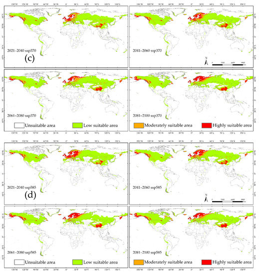 Predicted potential distribution of S. juvencus around the world under the future climate conditions during the periods of the 21st century under four CMIP6 climate scenarios and four shared socio-economic pathways: (a) ssp126; (b) ssp245; (c) ssp370; (d) ssp585.