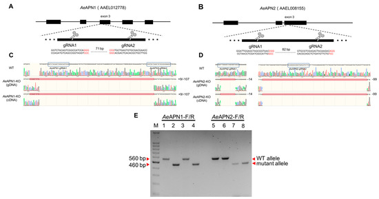 Generation of AeAPN knockout Ae. aegypti strains. Schematic representations of the AeAPN1 (A) and AeAPN2 (B) locus, where enlarged is the third exon contain 20-nucleotide sgRNA target sequences, and the PAM sequence shown in red. Aligned Sanger-sequencing trace of PCR-amplified using gDNA and cDNA from WT, AeAPN1-KO and AeAPN2-KO strains with specific primers (Table 1) spanning the gRNA targeted region (C,D). Electrophoresis of genomic-PCR products spanning target region from WT, AeAPN1-KO, AeAPN2-KO, and AeAPN1/AeAPN2-KO strains with specific primers AeAPN1-F/R and AeAPN2-F/R (E), Lane M: 100 bp DNA Ladder (TaKaRa, Dalian, China), Lane 1 and 5: the fragments were amplified from gDNA of the WT strain, Lane 2 and 6: the fragments were amplified from gDNA of the AeAPN1-KO strain, Lane 3 and 7: the fragments were amplified from gDNA of the AeAPN2-KO strain, Lane 4 and 8: the fragments were amplified from gDNA of the AeAPN1/AeAPN2-KO strain.