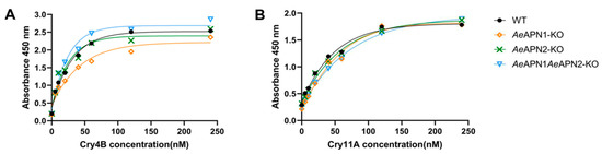 Binding of Cry4Ba and Cry11Aa toxins to Ae. aegypti BBMVs by ELISA. Different concentrations (0 nM, 5 nM, 10 nM, 20 nM, 40 nM, 60 nM, 120 nM, 240 nM) of Cry4Ba (A) and Cry11Aa (B) protoxins bound to 0.3 μg midgut BBMVs from APN mutant strains and WT strain in the ELISA plates.
