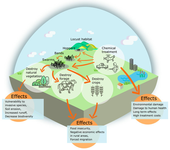 Outbreaks of locust and grasshopper are either chronic (e.g., grasshoppers in the African Sahel and grasshoppers/locusts in China) or episodic, with alternating periods of invasion and recession (e.g., the Australian plague locust and the desert locust) [4]. Locust outbreaks have many negative effects on land management, food security and the natural environment, ranging from total damage of crops and grazing fields to negative effects from control measurements when using insecticides. In Figure 1, we summarize general effects of locust outbreaks. In particular, the damage to crops and chemical contamination caused by control measurements have short- to long-term negative impacts [4,19].