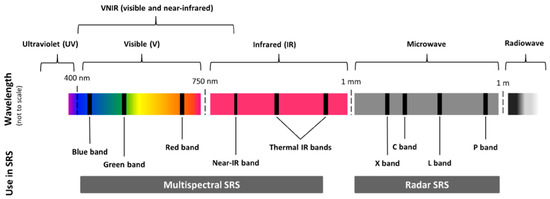 Electromagnetic radiation spectrum with bands used in satellite remote sensing (SRS) (from [25]).