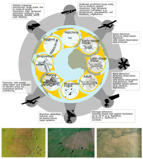 Upper: Representative life cycle of locust and grasshopper species including critical phases for locust management and where remote sensing can provide support and provide data. (a) Red, green, blue (RGB) image taken by a UAV from 80 m height with visible vegetation damage caused by early stage of the Moroccan locust (South Kazakhstan, April 2019). (b) Aerial image of bands of the Australian plague locust and visible caused damage (source: Figure 60 from [37], photos from Victorian Government Agriculture Department). (c) Bands of the Australian plague locust and damaged vegetation visible in airplane-taken RGB image from 400 m height (source: Figure 2 from [38]).
