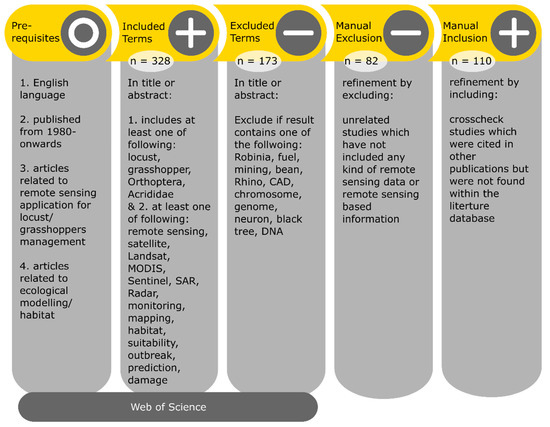Locust pest research and management cover several scientific disciplines. Therefore, potential articles cover a broad range of journals. For this review, we systematically reviewed 110 scientific publications including remote sensing applications which were published since 1980. The conducted literature search was based on the bibliographic digital database of Web of Science (last accessed on 15 December 2020) including Science Citation Index (SCI) journals and full-text conference contributions (Figure 4). For the literature search, we used specified terms and additional keywords including ‘locust’, ‘locust pest’, ‘locust plague’, ‘locust outbreak’ and ‘grasshopper’ in combination with ‘remote sensing’ or ‘satellite’, ‘UAV’, ‘airborne’ as well as ‘habitat’, ‘monitoring’, ‘prediction’, ‘control’, and ‘management’. This search query resulted in a very large number of research articles also including publications which are not related to locusts and grasshoppers (Orthoptera: Acrididae). Therefore, additional excluding keywords were applied. In a final step, we screened the resulting publications based on the following inclusion criteria which are relevant for this review: