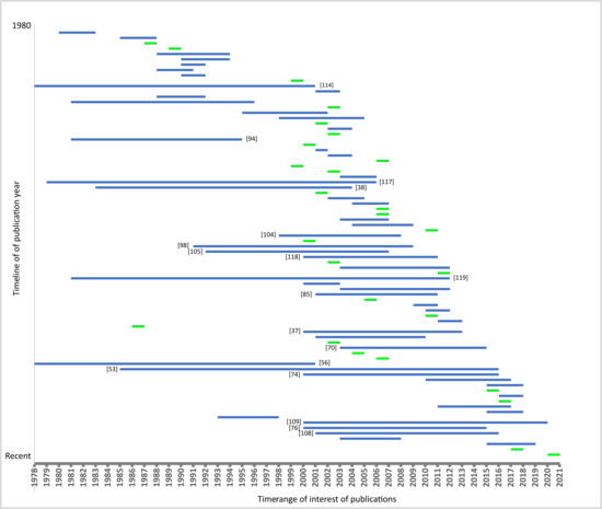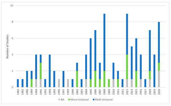 Temporal coverage of investigation within reviewed articles (green: mono-temporal studies, blue: multi-temporal studies; references indicate studies analyzing ten or more years).