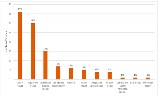 Total number of studies categorized by locust and grasshopper species. Note: the category migratory locust includes all subspecies, e.g., the Oriental, African and Asian migratory locusts.