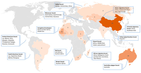 In this section, we would like to pay attention to countries and regions of interest which were in focus of reviewed publications (Figure 8). Obviously, the area of interest is related to the species and its habitat distribution. Nevertheless, several species habitats cover large areas and invasion regions across several countries. For example, the countries of the Sahel region, especially Burkina Faso, Chad, Ethiopia, Eritrea, Mauritania, Mali, Niger, Nigeria, Senegal, Somalia, and Sudan are particularly susceptible to the desert locust [5]. In general, the desert locust breeds extensively in arid and semi-arid zones extending from West Africa through the Middle East to Southwest Asia including the Arabian Peninsula, Pakistan and India. The habitat of the Italian locust spreads across Europe, Russia, Central Asia and China [58]. The different subspecies of the migratory locust such as the Asia, Oriental and African locusts are found in temperate and tropical zones of the eastern hemisphere [57]. On the contrary, the Australian plague locust, is only found in Australia.