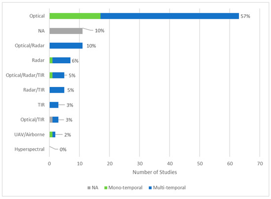 In terms of the investigated temporal scale, 18% of all studies were conducted only for one image representing the conditions at the time of overfly (mono-temporal). A total of 71% of studies were conducted for several images representing several states at different time steps or temporal development (multi-temporal, see also Figure 5). Within multi-temporal studies, we can further discriminate between studies which applied multiple mono-temporal processing steps to mirror the state at these dates (28%), and studies applying time-series analyses (43%). Studies marked as “NA” (11%) are reviews and general articles without a specific data analysis part.