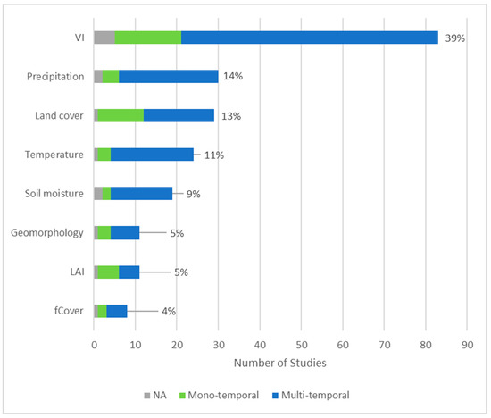 Among variables, parameters and metrics, we found that vegetation indices (39%), precipitation (14%), land cover classification (13%), temperature (11%) and soil moisture (9%) are dominant (Figure 10). Within the vegetation indices (VI), the Normalized Difference Vegetation Index (NDVI) was applied in most cases with only few exceptions (e.g., Enhanced Vegetation Index (EVI)). Furthermore, the usage of geomorphological metrics derived either from optical or SAR data have shown great potential [62] but its application was found only in 5% of studies. Moreover, very few studies use the Leaf Area Index (LAI) (5%) or fraction of vegetation Cover (fCover) (4%).
