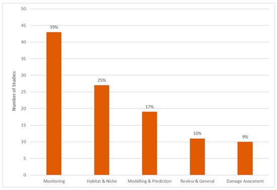 The total selected 110 studies were analyzed to extract relevant information for this review in two main aspects. The first aspect includes publication-specific information about “species of interest”, “region of interest”, “applied remote sensing sensor” and “derived variables from remote sensing data”. Additionally, we extracted involved authors’ affiliation to investigate where main research is based compared to regions of interest. The second aspect includes thematical foci which were categorized into “habitat mapping”, “habitat monitoring”, “forecast of hatching/outbreak”, “damage assessment” as well as “review and general articles” without a specific data analyzing part (Table 1).