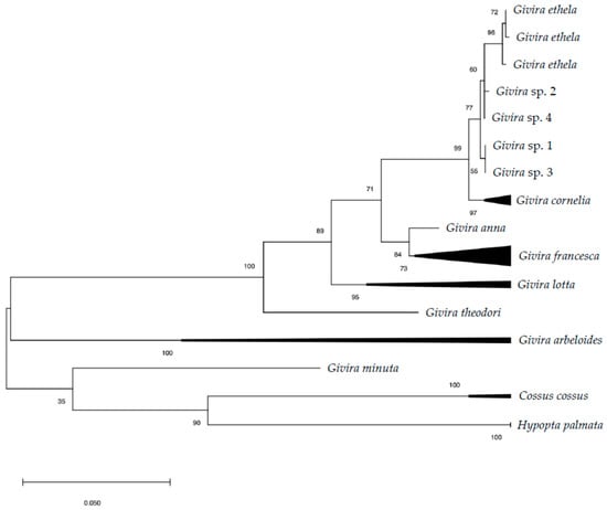 The following are available online at https://www.mdpi.com/2075-4450/12/3/239/s1, Table S1: Barcodes complete sequences of Givira species available in BOLD System [29] used in the maximum likelihood tree, Table S2: Givira ethela barcode details obtained from the analyzed samples.