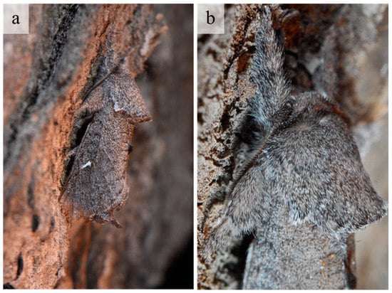 The external habitus of the reared specimens fall under G. ethela, following the identification key provided by Barnes and McDunnough [32] and matching the morphological traits reported in Neumoegen and Dyar [33] and Dyar [34], and illustrated in Seitz [35]. Givira ethela is a dark colored moth with grayish–brownish body hairs and scales; adults present a whitish ✓-shaped mark on the forewing (Figure 2). Male and female genitalia are reported in Figure 3 for illustrative purposes only. The pupa shows rows of spine-like processes on abdominal segments (Figure 4).
